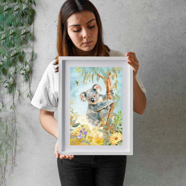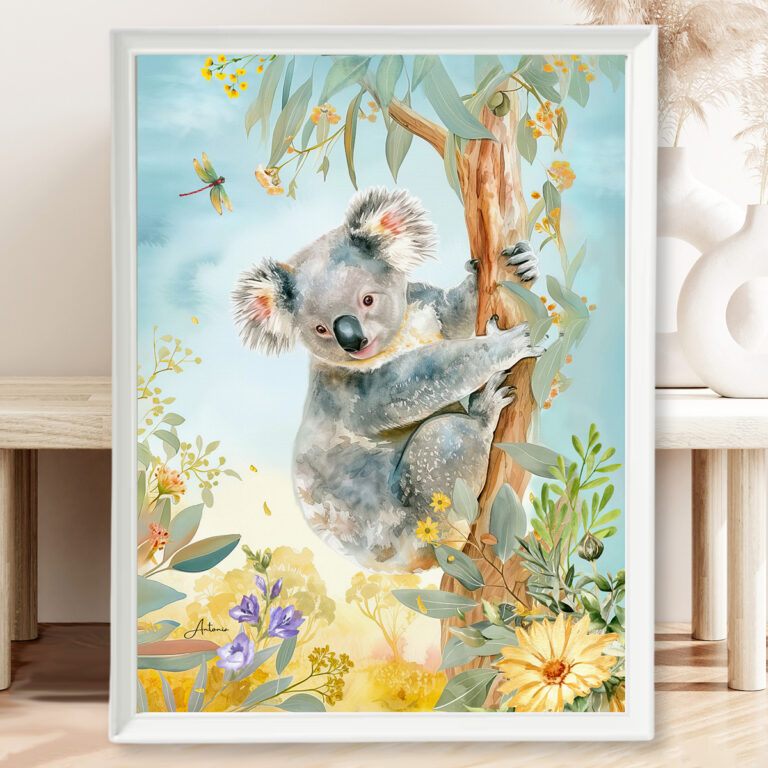 Koala Among Bush Flowers and Leaves in Warm Pastels, Australian Native Print