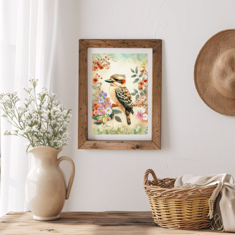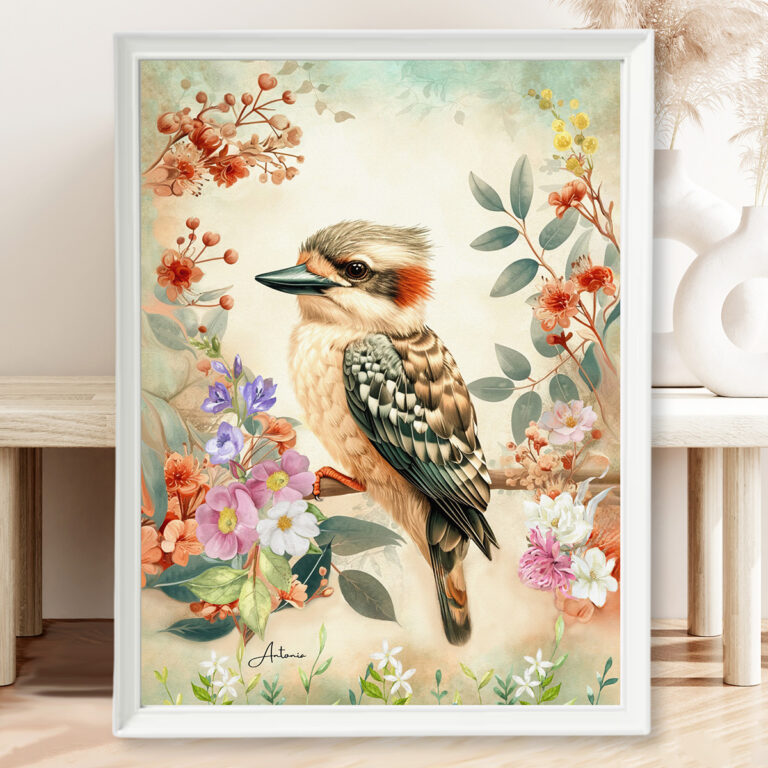Australian Baby Kookaburra with Wildflowers in Warm Pastels, Australian Native Print