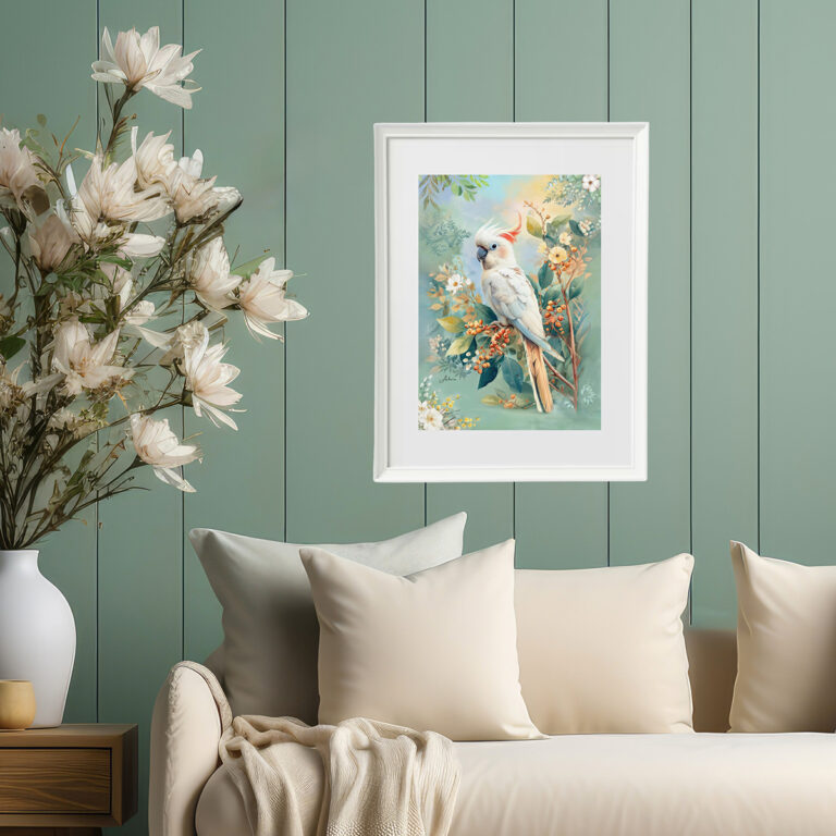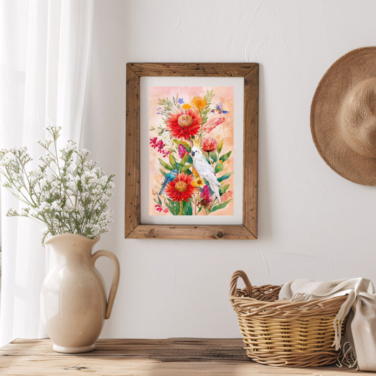 Australian Cockatoo with Wildflowers in Warm Pastels, Australian Native Print