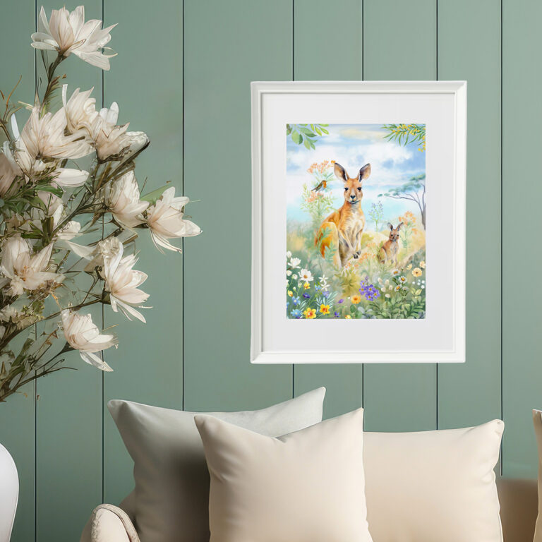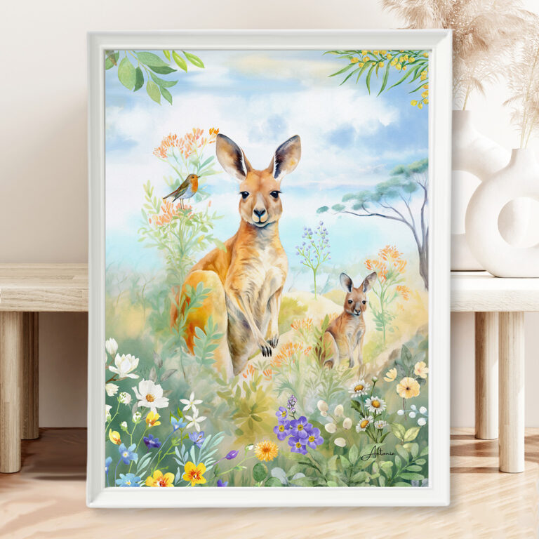 Australian Kangaroos with Wildflowers in Warm Pastels, Australian Native Print