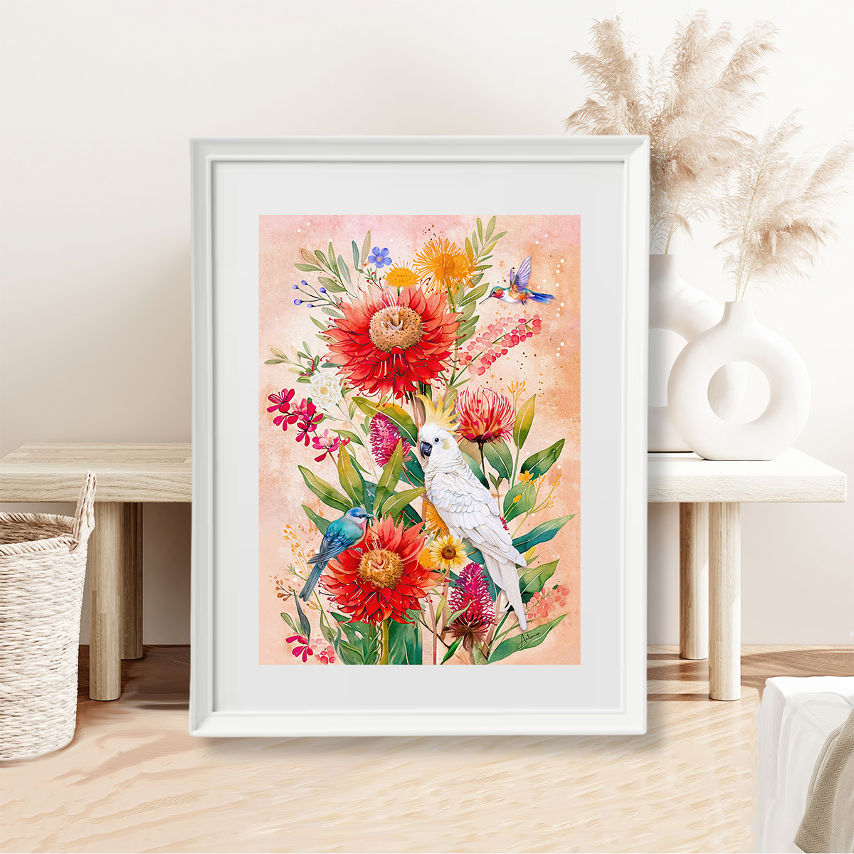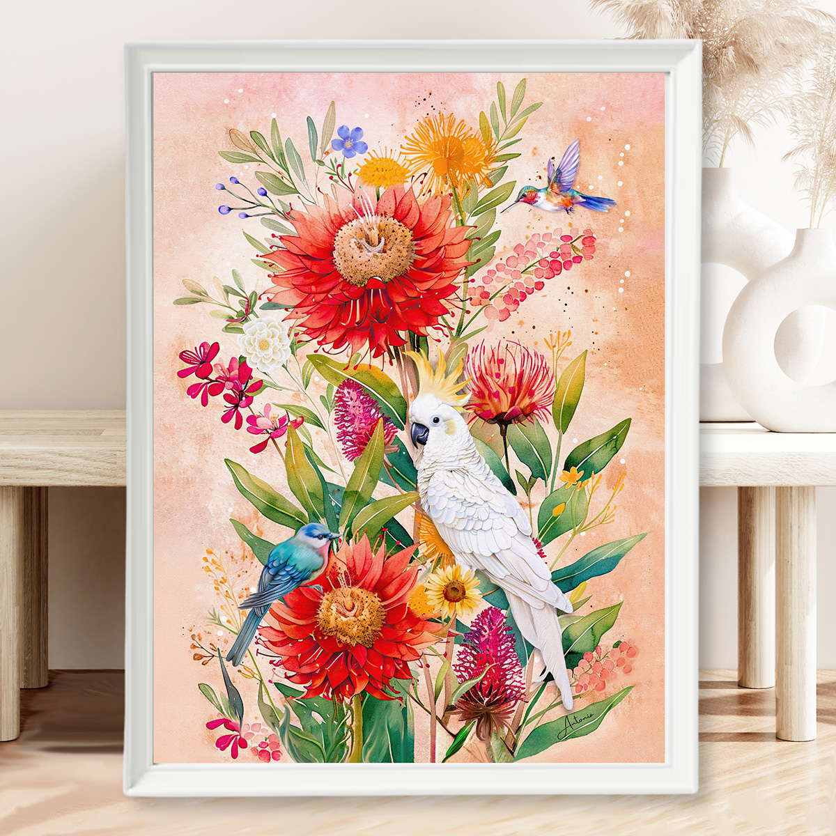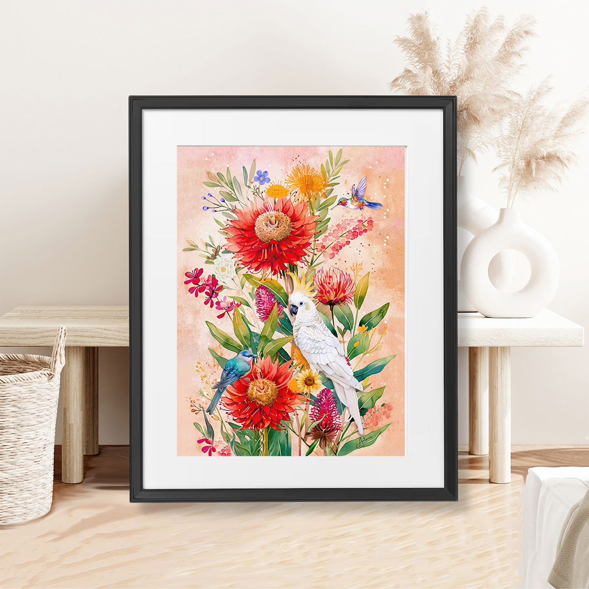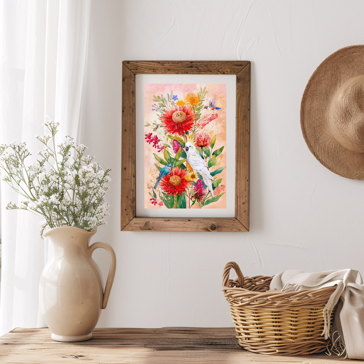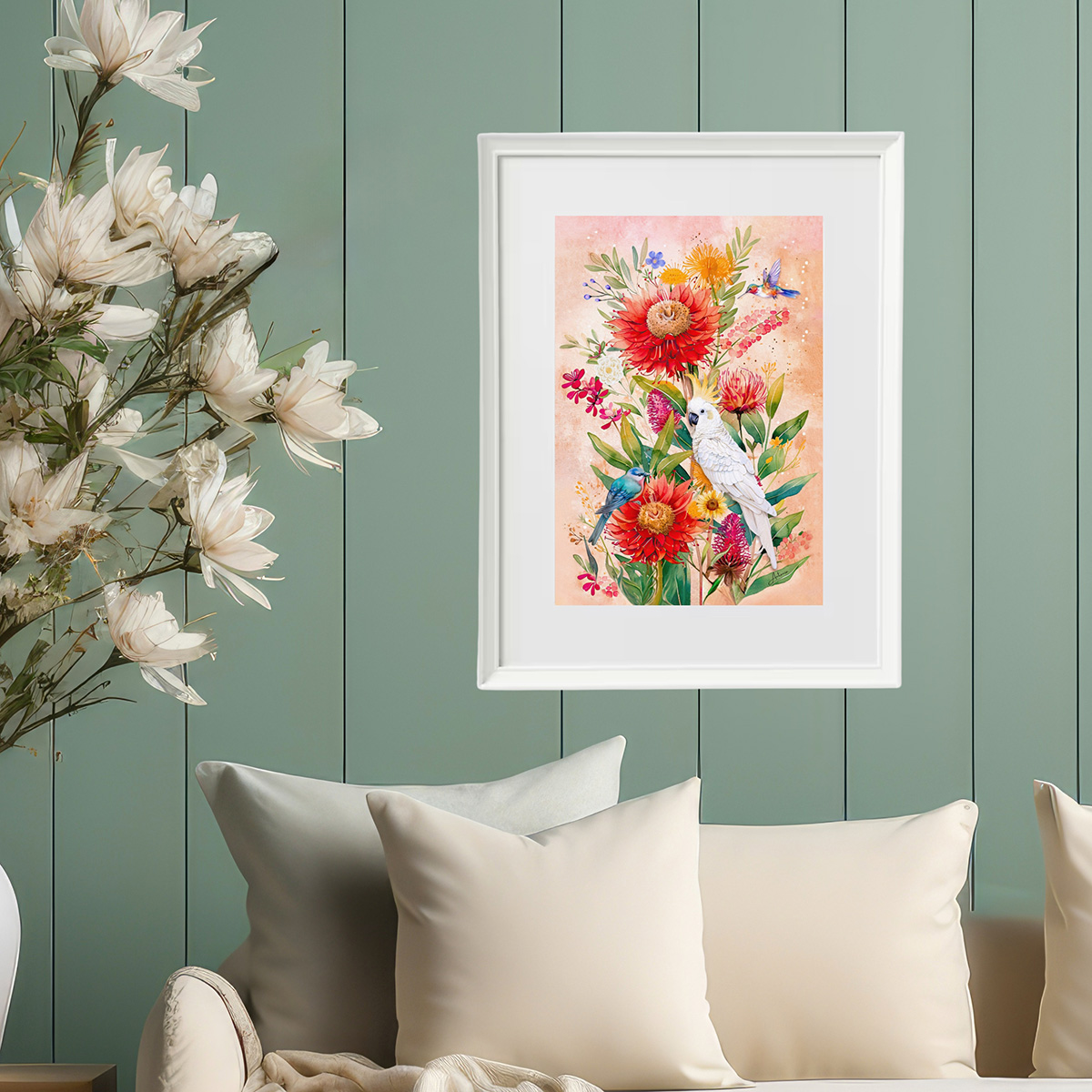 A serene scene of Australian bush flowers in warm pastel hues, featuring three birds, capturing the essence of nature’s beauty and tranquility. The delicate brushstrokes and soft colors create a tranquil scene, perfect for any nature lover’s collection. Each piece is created and printed in-house, ensuring exceptional quality and detail. Enhance your space with our captivating collection. Printed here in our studio with 12-color technology at 300 DPI for vibrant, high-definition prints on 250 or 300 gsm premium art paper. Richly detailed with amazing colors! If you choose the framed option, the art piece will be elegantly set in the white matboard inside of the frame for best possible presentation of the art.